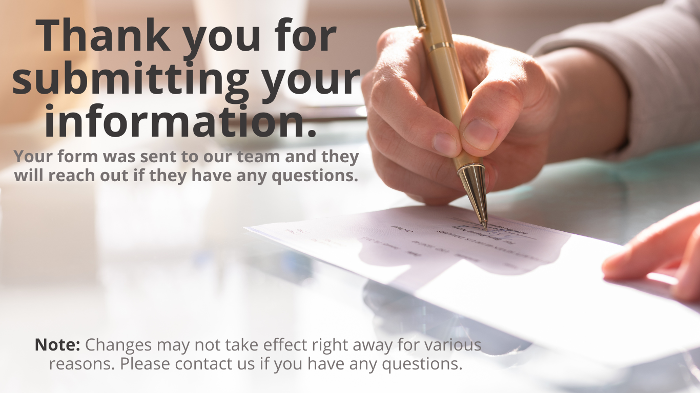 Thank you for submitting your information. Your info was sent to our team and they will reach out if they have any questions. Note: Changes may not take affect right away for various reasons. Please contact us if you have any questions.
